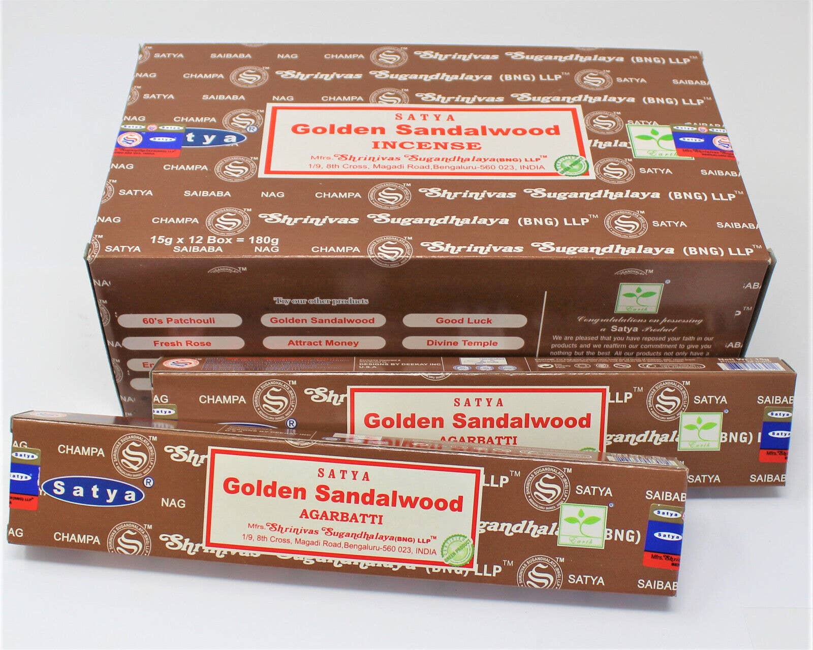 (Satya) Golden Sandalwood Incense Sticks 15 g./Pack, Authentic Nag Champa incense sticks, hand-rolled in Bangalore, India by Satya Sai Baba. Nag Champa Incense is made from mixture of herbs, floral extracts and oils, which are hand rolled onto a bamboo stick. It has become the world's best selling incense, popular for yoga studios, meditation and general burning for relaxation MADE IN INDIA