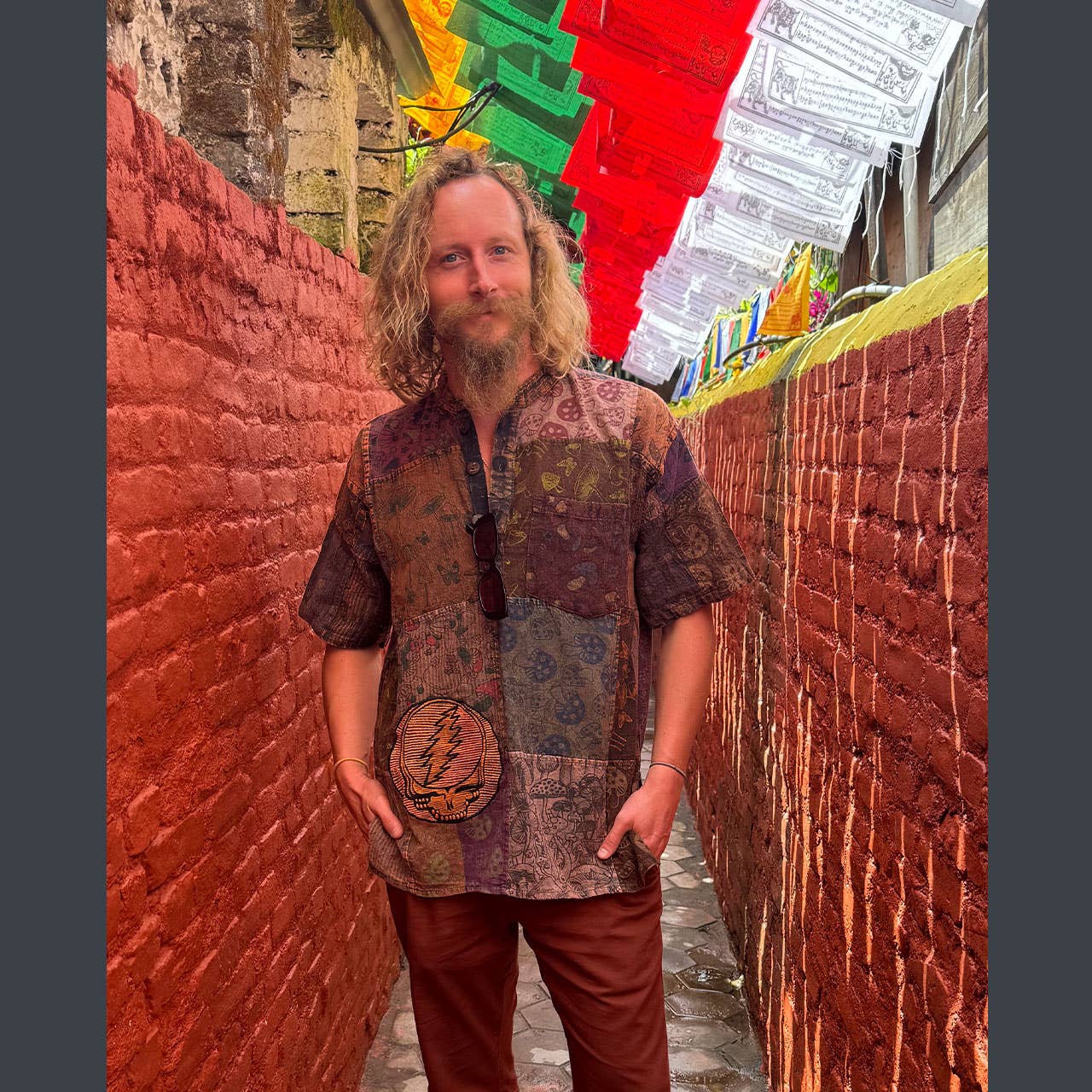 Shakedown Shroom Shirt. This men's upcycled patchwork cotton kurtha offers a unique blend of comfort and style, perfect for those with a bohemian spirit. The shirt features an eclectic mix of assorted mushroom prints, bringing a natural, earthy vibe to your wardrobe. The tonal embroidered Grateful Dead "Steal Your Face" patch adds a subtle yet iconic touch, positioned perfectly on the chest pocket. With its relaxed fit and breathable fabric, this kurtha effortlessly merges vintage flair with modern sustainability, making it an ideal piece for any laid-back occasion. Each shirt is one-of-a-kind, crafted from upcycled materials for a sustainable, eco-conscious choice.oom Print Men's Short Skeeve Kurtha with Spaced out Steal Your Face Tonal Embroidery.