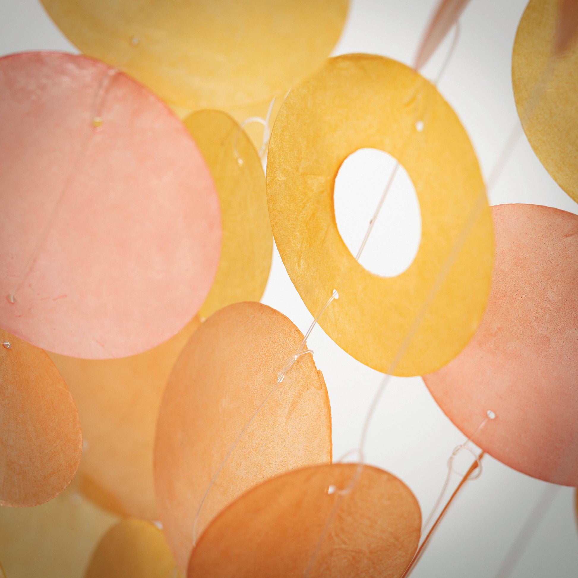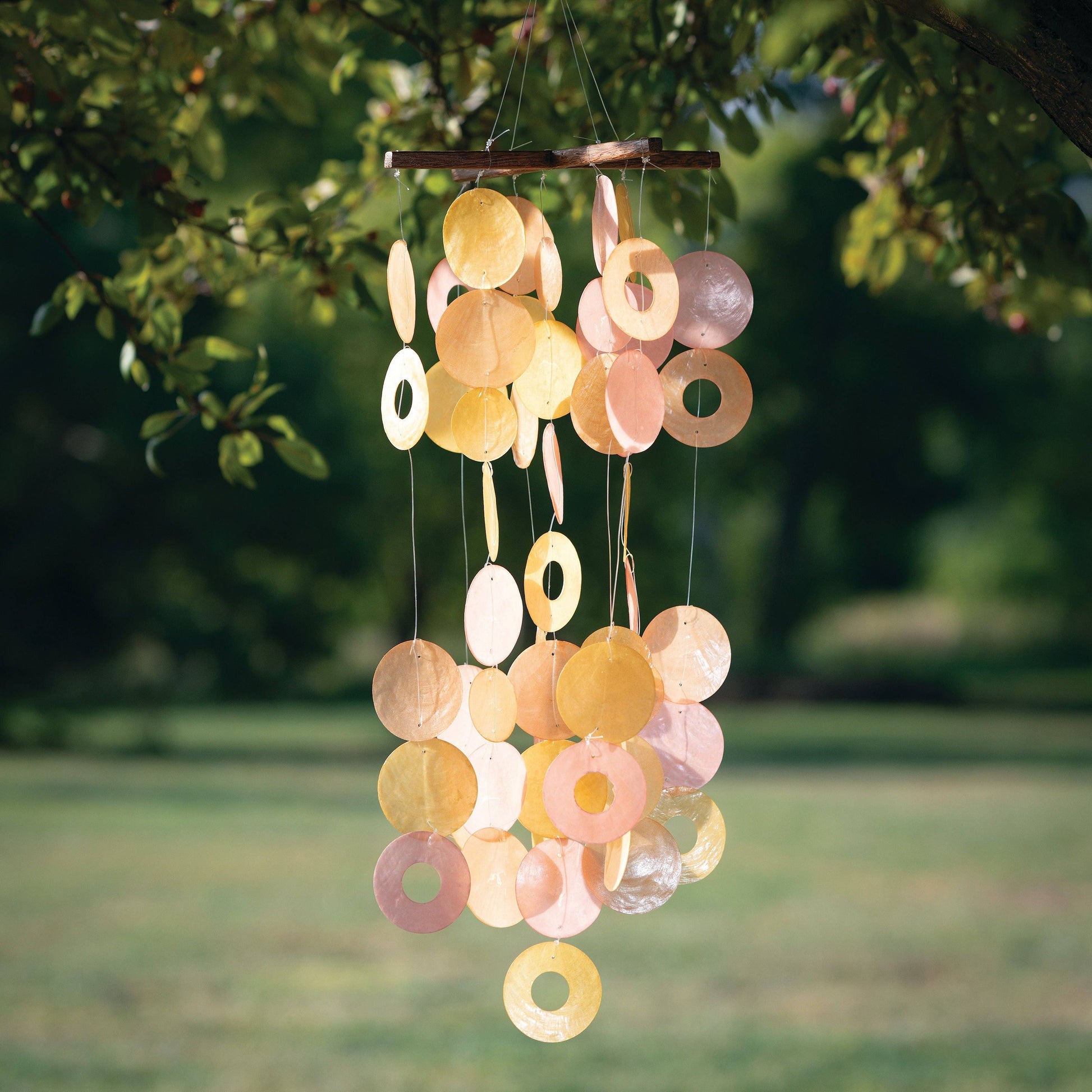 Our handcrafted capiz windchimes are made by Balinese artisans. Hand strung and hand dyed, these chimes are made of natural, renewable materials. When touched by the wind, your chime will produce a delicate tinkling musical sound.